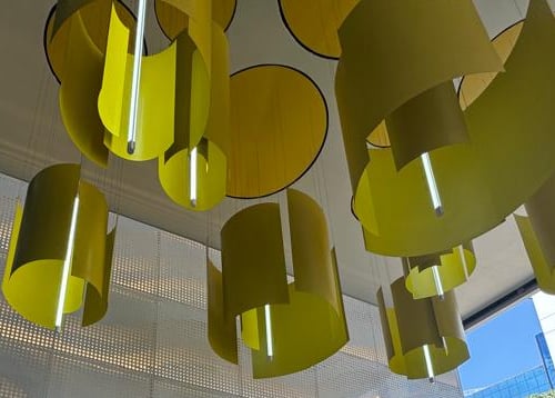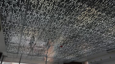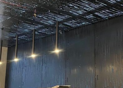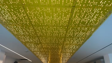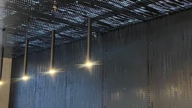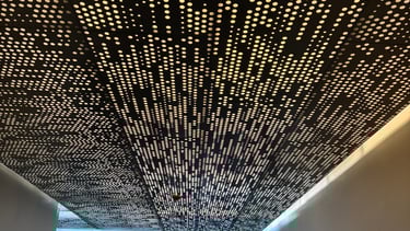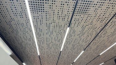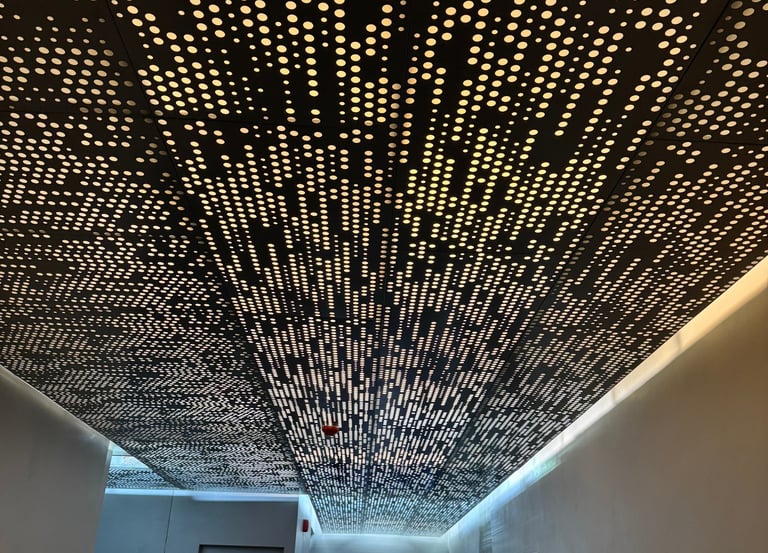 Imagine un techo que parece una superficie sólida de color gris antracita durante el día, pero que al caer la tarde se transforma en un panel luminoso que guía a los visitantes. Con nuestros techos microperforados, usted tiene el control total sobre la iluminación y el sonido de su espacio