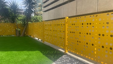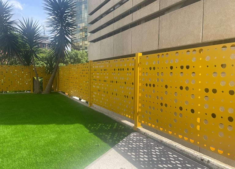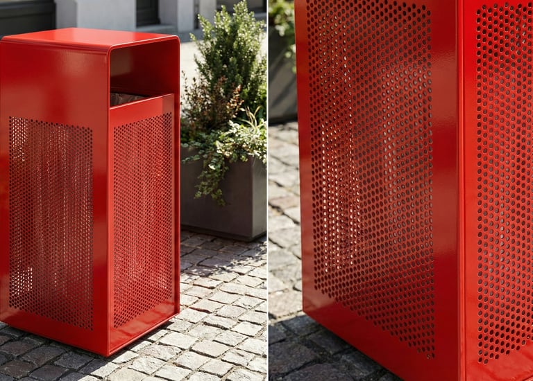 Utilizamos la tecnología de metal microperforado para crear piezas que "respiran", permitiendo que la luz y el aire fluyan a través de ellas, eliminando la sensación de pesadez visual. Pero la belleza no sacrifica la resistencia. Cada pieza es blindada con pintura electrostática en polvo (powder coating), un proceso de curado al horno que garantiza una barrera impenetrable contra la corrosión, los rayos UV y el uso intensivo.
