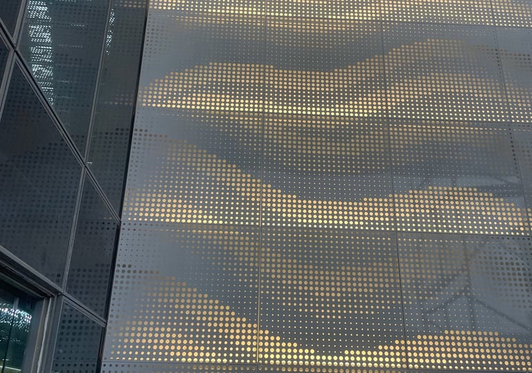 Esta es una de las ventajas más impactantes. Al retroiluminar las fachadas microperforadas con sistemas LED, el edificio se transforma por la noche en una verdadera obra de arte lumínica. Las perforaciones permiten que la luz se filtre de manera uniforme y controlada, creando efectos visuales impresionantes, patrones cambiantes y la posibilidad de mostrar logotipos o textos con un impacto visual inigualable