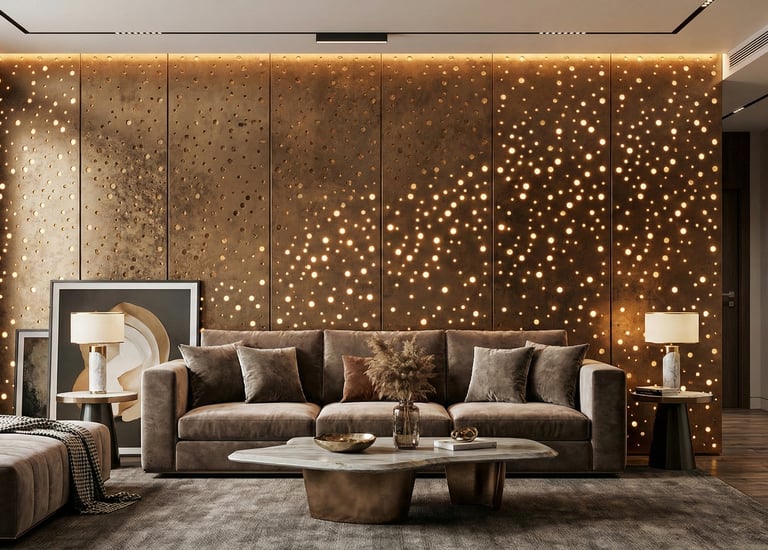 Paredes decorativas microperforadas que transforman espacios planos en experiencias tridimensionales.